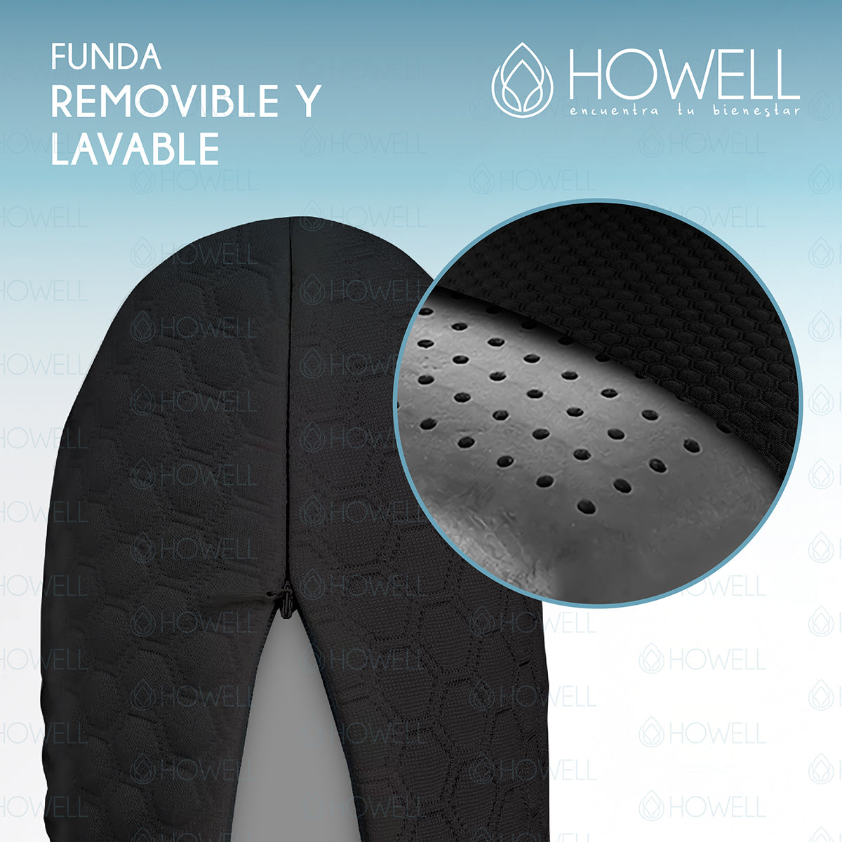 Lo que la hace verdaderamente especial es su tecnología Air Cell: pequeñas celdas de ventilación distribuidas en toda la espuma que permiten una circulación de aire constante, evitando el calor excesivo mientras duermes. Además, vuelve a su forma original en solo 3 segundos, sesión tras sesión, sin perder su capacidad de adaptación. Su funda exterior en tela negra premium es removible y lavable con cierre, facilitando la higiene. Y su perfil ergonómico y medidas generosas la hacen perfecta para todo tipo de posiciones de sueño.