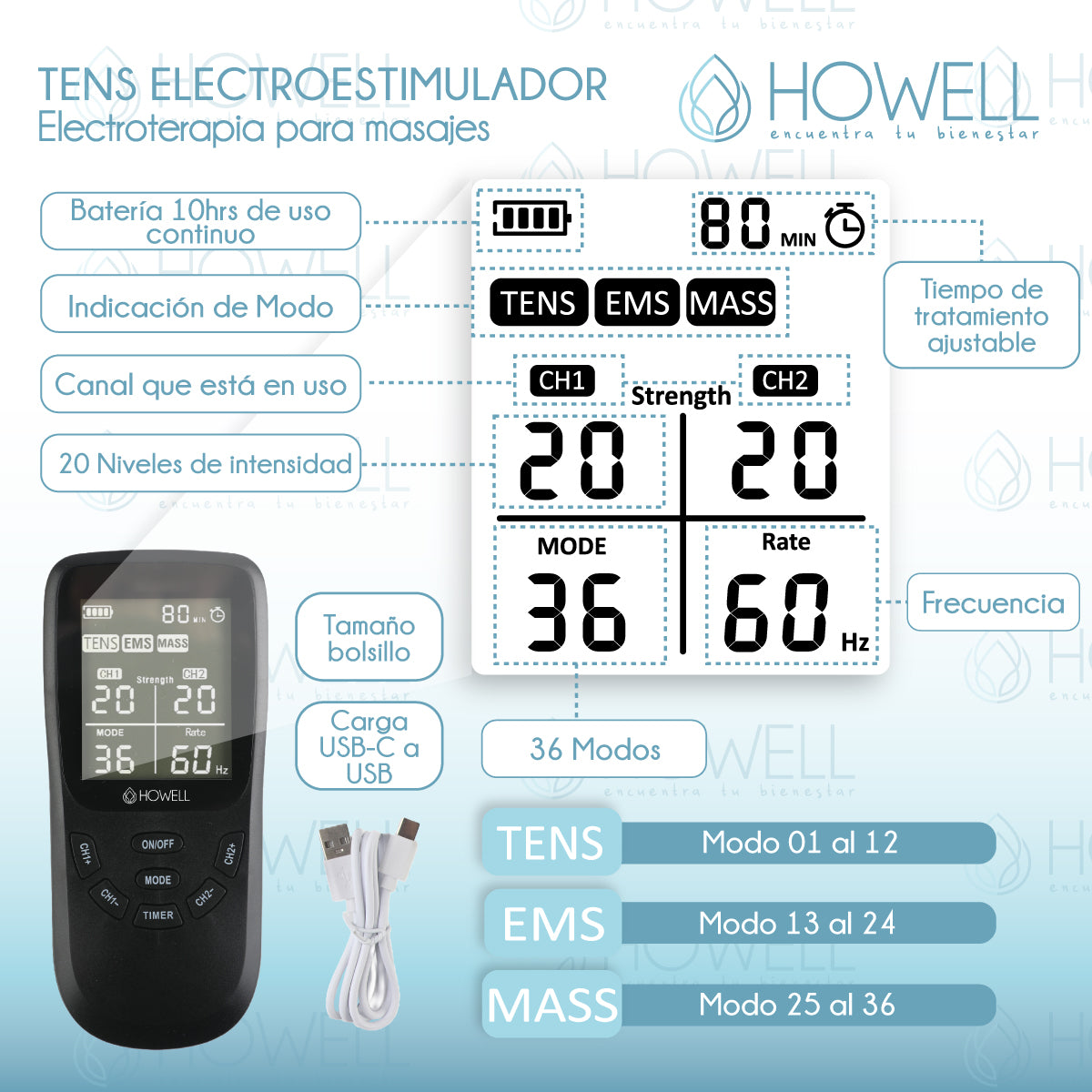 Tens Electroestimulador Muscular 36 Modos Howell EMS Dual