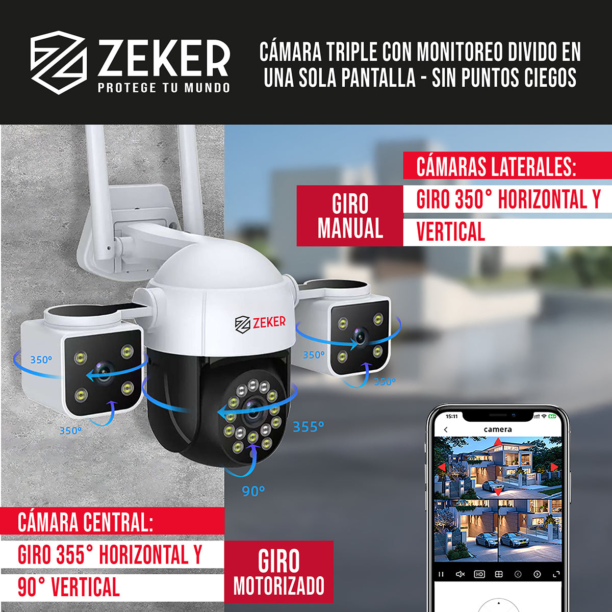 Triple lente para cobertura completa, su diseño único con tres cámaras integradas garantiza un monitoreo total sin ángulos muertos. Cada lente trabaja en conjunto para brindarte una vigilancia completa, incluso en las zonas más difíciles.